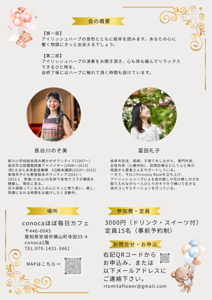 大人のための絵本読み聞かせとアイリッシュハープのお茶会を愛知県安城市で開催します🎵