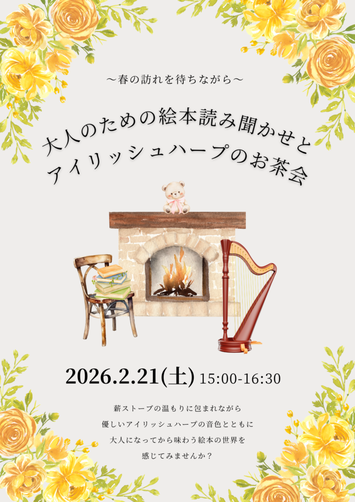 2026年2/21安城市で「大人のための絵本読み聞かせとアイリッシュハープのお茶会」開催します♪